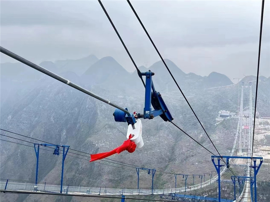 4月9日,由我公司生產的花江峽谷大橋首根主纜索股牽引完成,標志著在建的世界第一高橋正式進入上構主纜架設施工階段。
