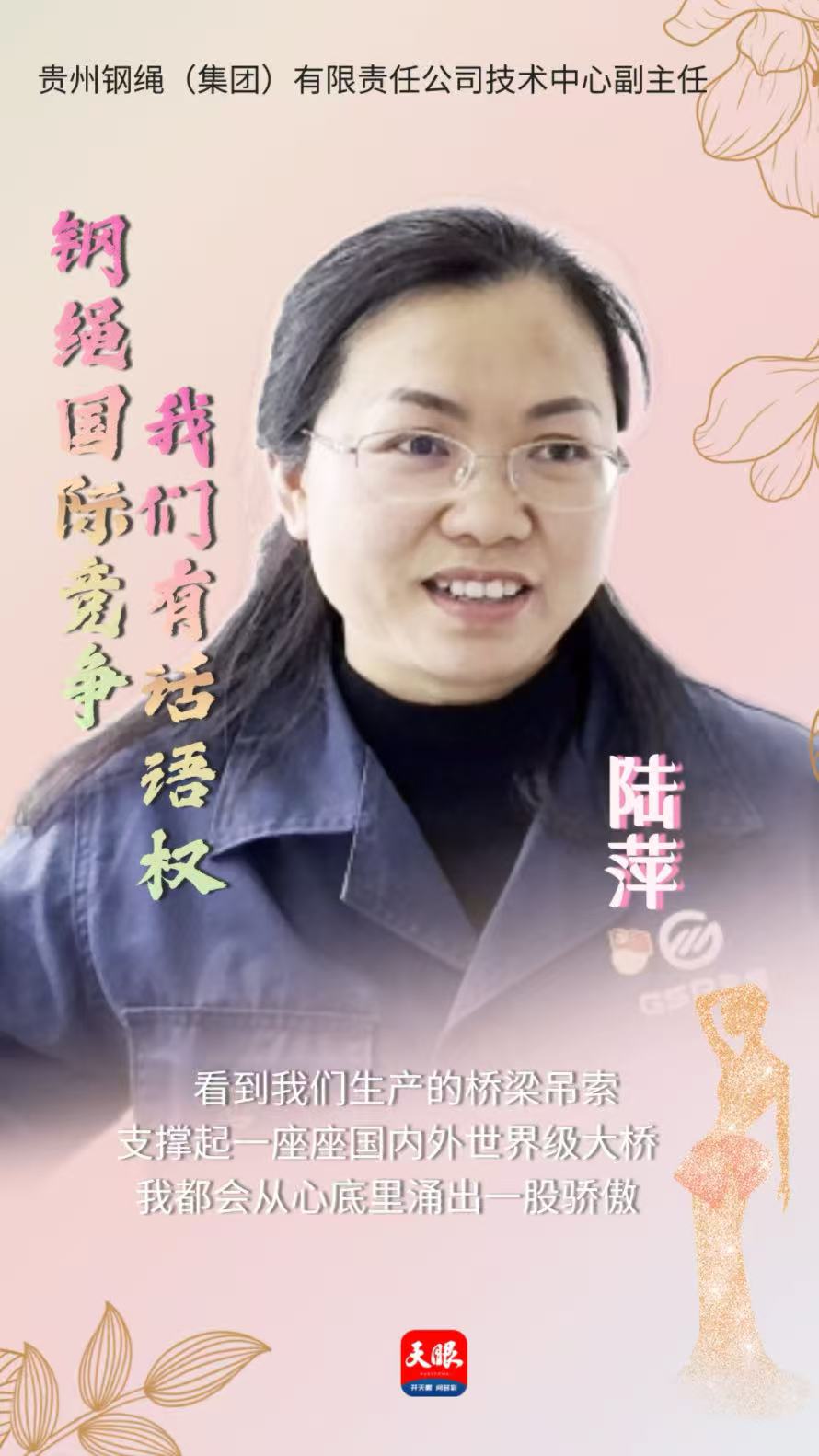 “今天,貴州鋼繩產品支持了國內外一座座橋梁的建設。每次回老家,經過北盤江大橋、壩陵河大橋,看到我們生產制造的橋梁吊索支撐起這一座座世界級大橋,我都會從心底里涌出一股驕傲和自豪。”陸萍說。