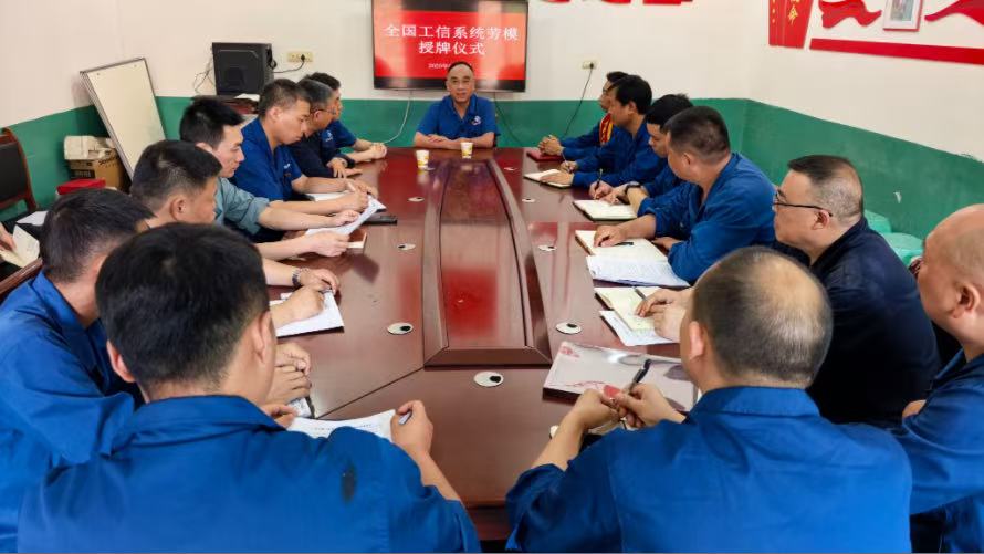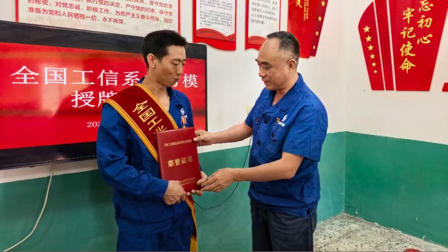 6月11日,集團公司黨委副書記、工會主席馬明剛為榮獲“全國工業和信息化系統勞動模范”稱號的勾明松頒發榮譽證書。