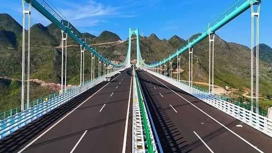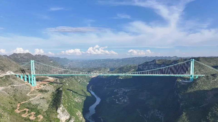 花江峽谷大橋是六枝至安龍高速公路的關(guān)鍵控制性工程。大橋全長(zhǎng)2890米,主橋跨徑1420米,橋面到水面高度625米,主橋跨徑居山區(qū)橋梁跨徑世界第一,橋梁高度居世界第一,被譽(yù)為“橫豎”都是第一的世界級(jí)橋梁。大橋的上部構(gòu)件,包括主纜索股、吊索、纏繞絲、貓道繩、扶手繩以及施工繩等全部由貴州鋼繩研制生產(chǎn)。