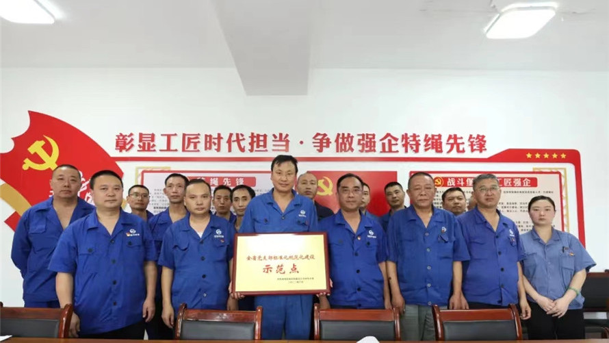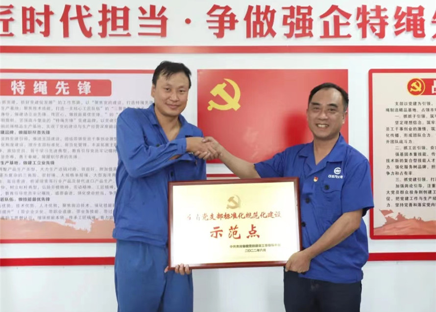 8月3日,集團公司黨委副書記、工會主席馬明剛為公司獲第三批“全省黨支部標準化規(guī)范化建設示范點”——特繩黨支部授牌。