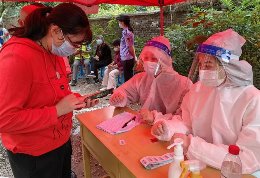 中秋節(jié)當(dāng)天,貴繩社區(qū)的工作人員和志愿者們早早來到大操場,提前做好即將開展的第一輪全員核酸采集準(zhǔn)備工作。按照遵義市疫情防控 “2+2”全員核酸檢測和抗原檢測要求,貴繩社區(qū)共設(shè)置三個點、9個臺位,為社區(qū)居民提供方便,并開通老年人專用通道,做好健康碼、行程碼和核酸采集掃碼,以及2米間隔排隊疏導(dǎo)等輔助工作,為醫(yī)務(wù)人員核酸采集工作做好準(zhǔn)備。中午12:00,馳援貴繩的醫(yī)務(wù)人員趕到,核酸采集開始,各樓棟居民有序排隊進(jìn)行核酸采集。13:30后,天空下起小雨,盡管志愿者們的衣服打濕了,可他們依然堅守在抗疫一線。