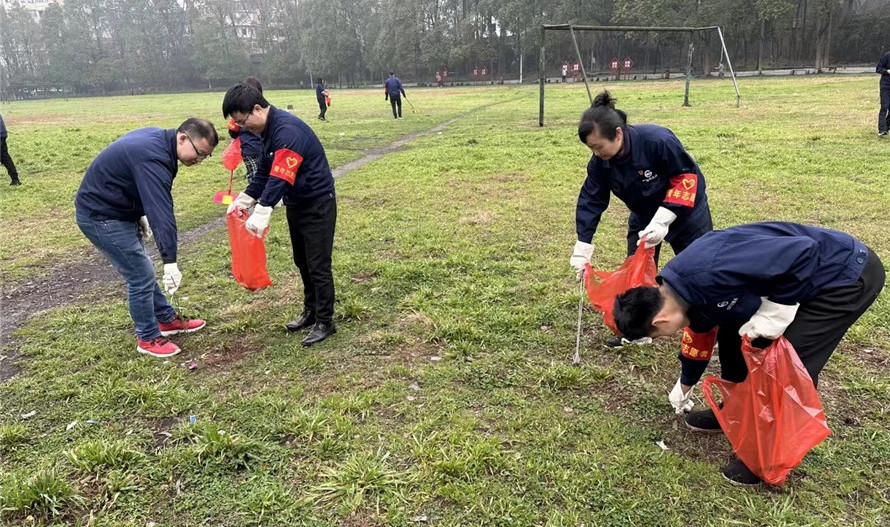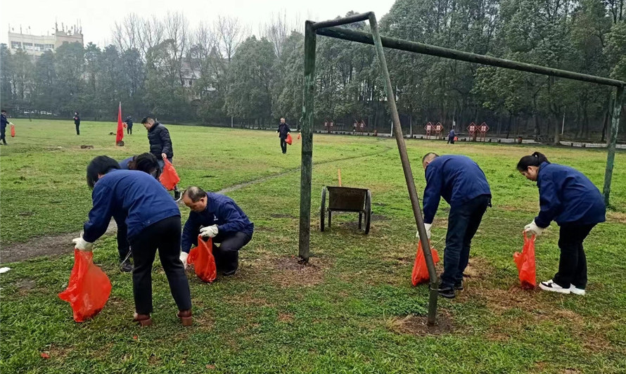 30余名青年志愿者佩戴紅色志愿者袖標、手套,拿著鏟子、掃帚等工具,清理操場的廢紙、食品包裝袋等生活垃圾,所到之處形成了一道亮麗風景。