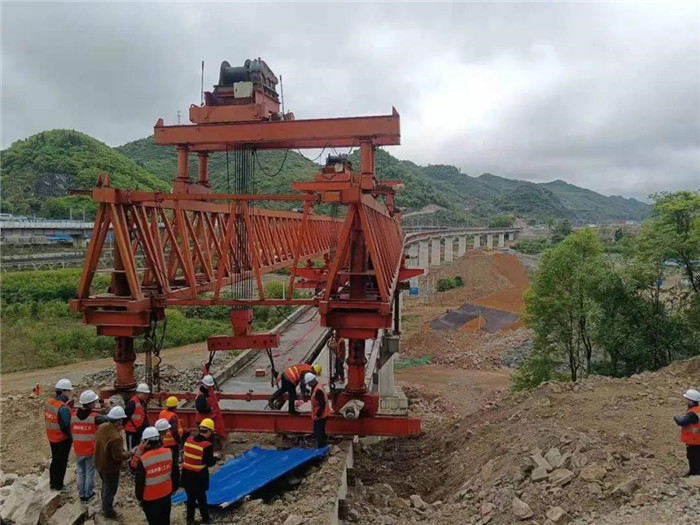 新區鐵路專用線牽出線特大橋上跨位于建南溪大道,是該鐵路線建成投運后的中心樞紐。牽出線特大橋共16跨32片預制梁,其中32米跨度的雙片梁有14跨,梁片單重達135噸;24米跨度的雙片梁有2跨,梁片單重99噸,運輸及架設難度非常大。為保證工程質量,所有梁片均由中鐵四局一公司貴陽花溪制梁場預制后轉運至場內。