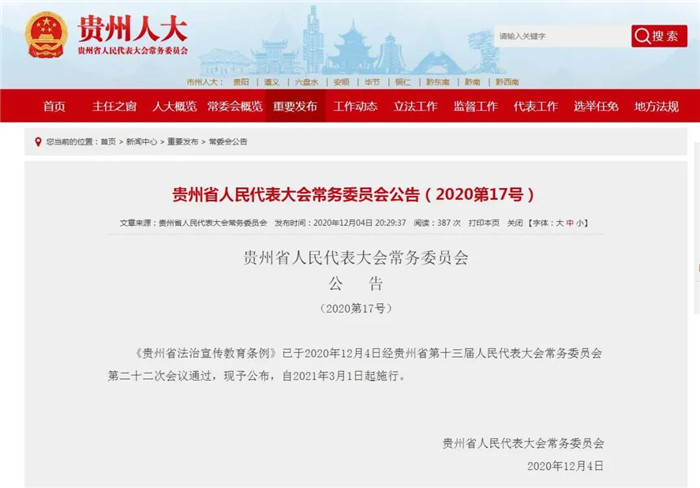 《貴州省法治宣傳教育條例》已于2020年12月4日經(jīng)貴州省第十三屆人民代表大會常務(wù)委員會第二十二次會議通過。